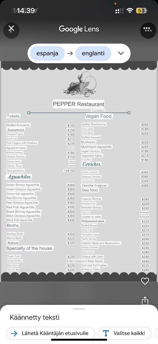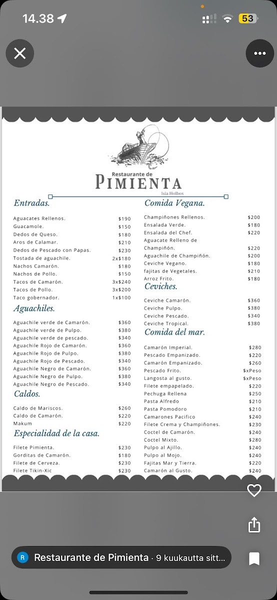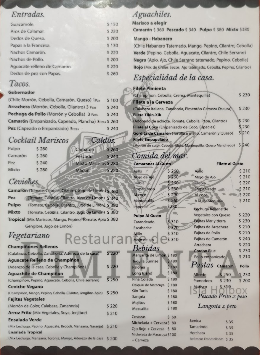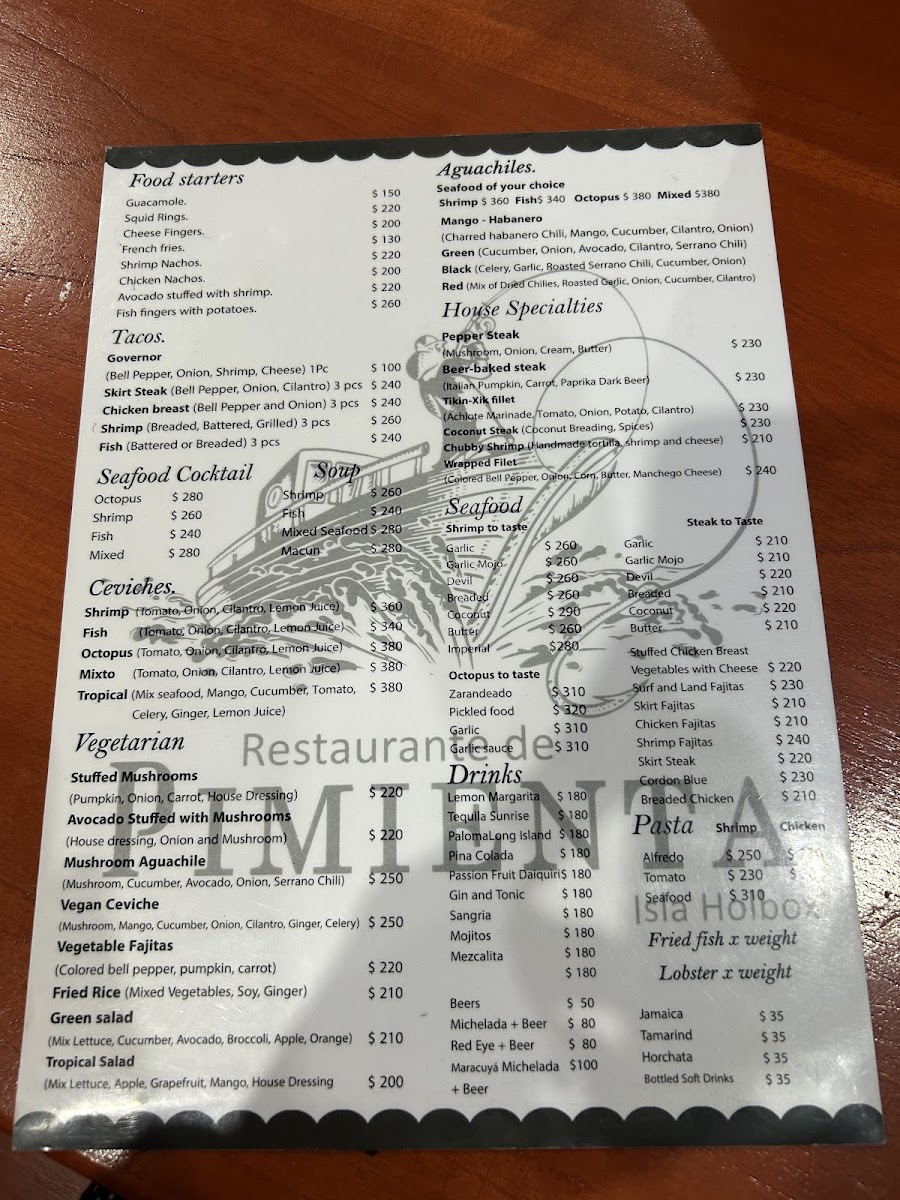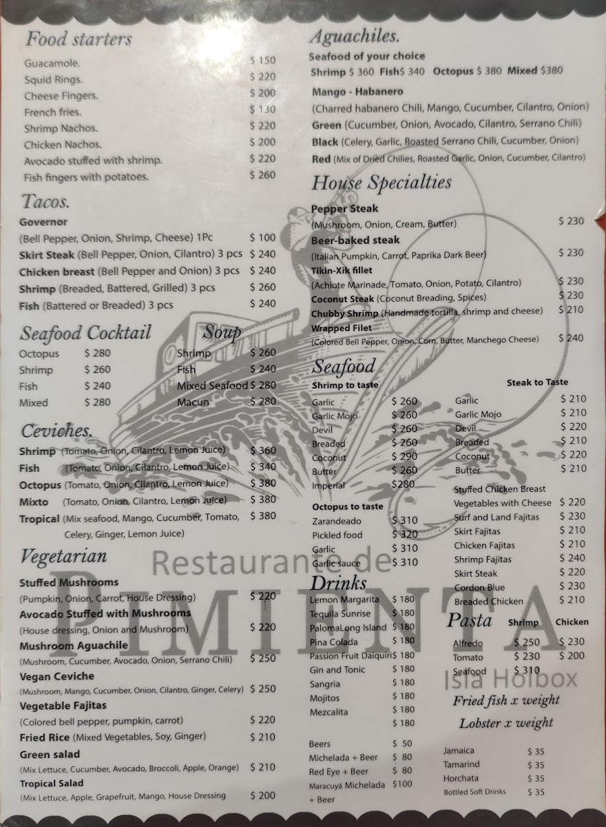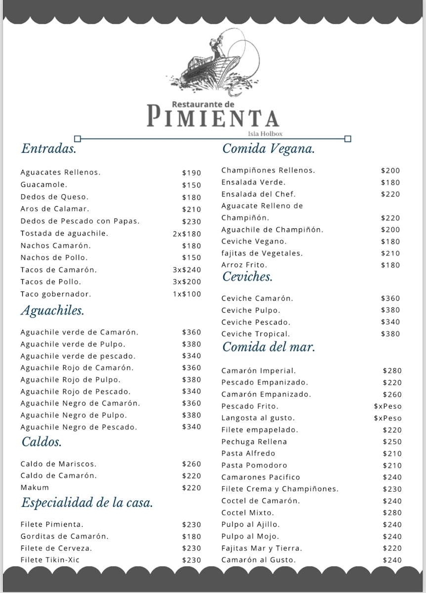 The menu at Restaurante De Pimienta in Holbox offers a delightful blend of fresh seafood and traditional Mexican flavors. The standout dish, Beer Fillet, is a must-try. The fillet, cooked to perfection, pairs beautifully with a light beer batter that enhances the natural flavors of the fish. For those craving something more substantial, the restaurant’s grilled shrimp and ceviche selections are also exceptional, showcasing the region’s rich coastal offerings. The menu includes a variety of dishes that cater to different tastes, with options ranging from light seafood appetizers to hearty main courses. The use of local ingredients adds a unique touch to each dish, ensuring a fresh, flavorful dining experience. Whether you're enjoying the Beer Fillet or sampling other dishes, Restaurante De Pimienta promises an unforgettable meal in the heart of Holbox.